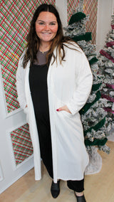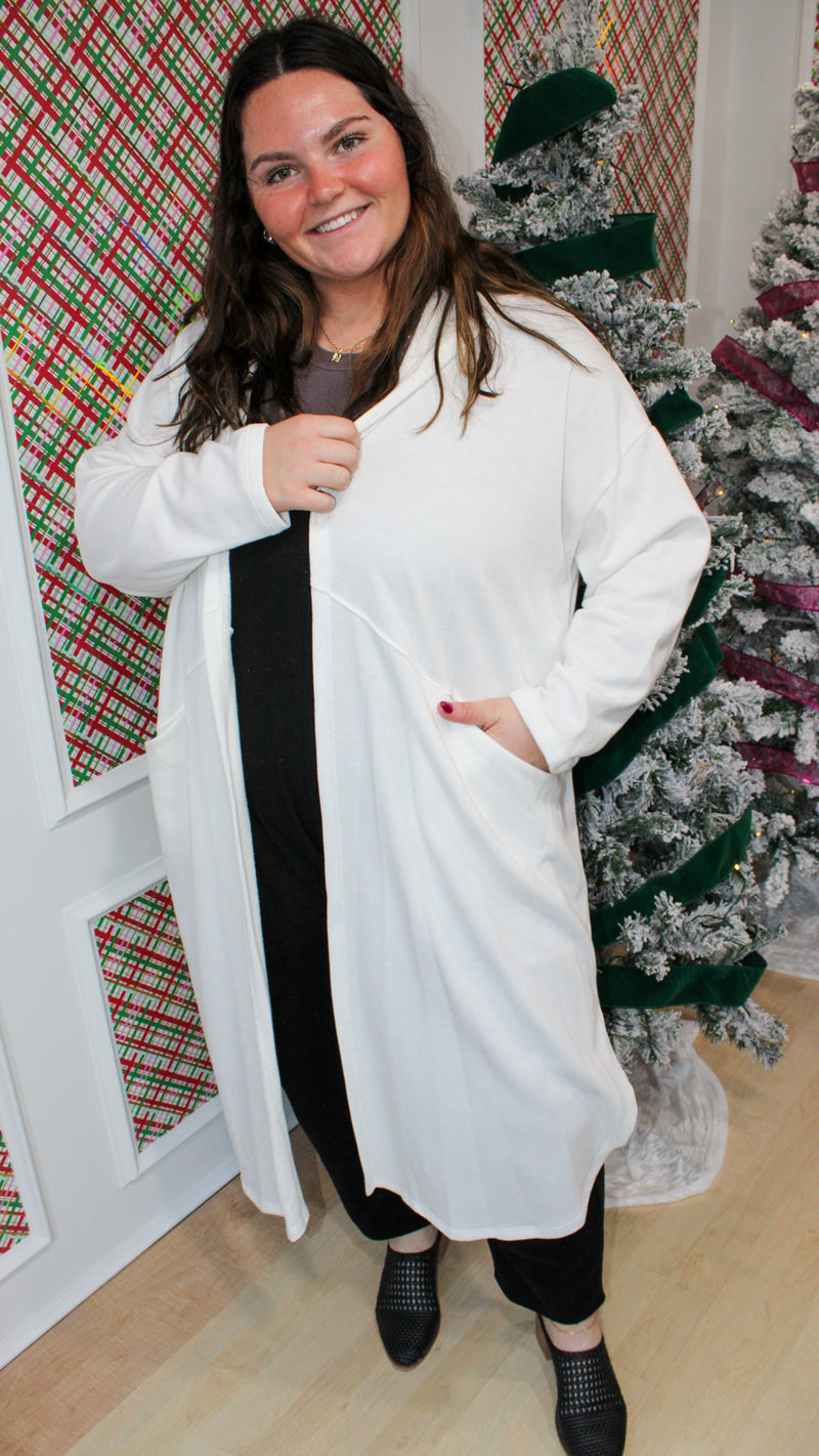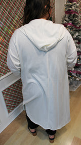 A white long cardigan with a hood. Works great for running errand or just lounging around in it.
