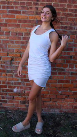 A baby blue colored dress with a scooping neckline and a scrunch on the side. This dress can be worn as is or as a swim cover-up.